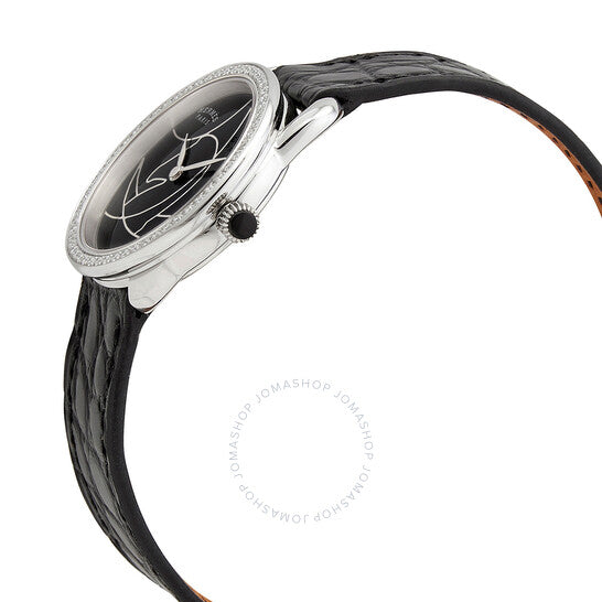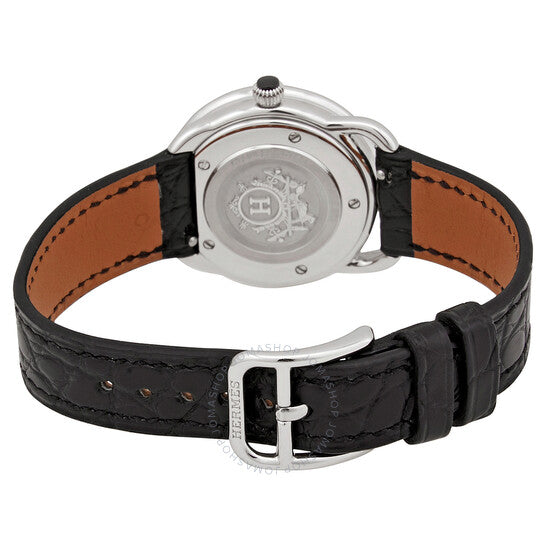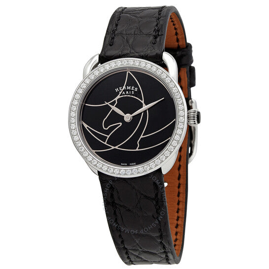 علبة من الفولاذ المقاوم للصدأ مع سوار أسود من جلد التمساح. إطار ثابت من الفولاذ المقاوم للصدأ مرصع بـ 56 ماسة. ميناء مطلي بالمينا الأسود (مطعّم) بعقارب فضية اللون. بدون مؤشرات. نوع الميناء: تناظري. حركة كوارتز. زجاج ياقوت مقاوم للخدش. تاج قابل للسحب/الدفع. غطاء خلفي صلب. شكل دائري. حجم العلبة: 28 مم. مشبك تانغ. مقاومة للماء حتى عمق 30 مترًا / 100 قدم. الوظائف: الساعات، الدقائق. معلومات إضافية: علبة مرصعة بـ 56 ماسة (0.45 قيراط). سلسلة أرسو كافال. طراز ساعة رسمية. علامة الساعة: صناعة سويسرية. ساعة هيرمس أرسو كافال كوارتز نسائية بمينا سوداء، 045726WW00.