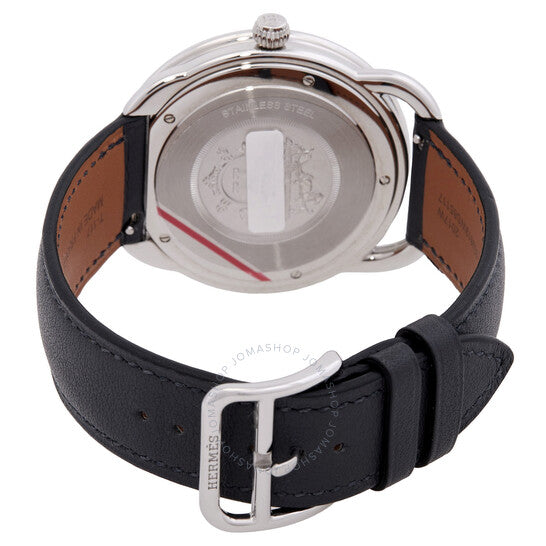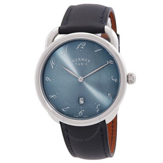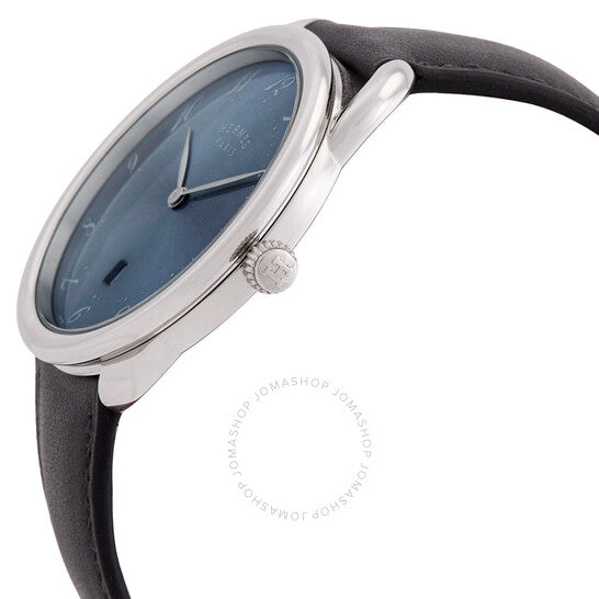 علبة من الفولاذ المقاوم للصدأ فضية اللون مع سوار جلدي أسود. إطار ثابت من الفولاذ المقاوم للصدأ فضي اللون. ميناء أزرق بعقارب فضية اللون وعلامات ساعات بأرقام عربية. علامات دقائق حول الحافة الداخلية. نوع الميناء: تناظري. عرض التاريخ عند موضع الساعة السادسة. حركة كوارتز. زجاج ياقوتي مقاوم للخدش. تاج قابل للسحب/الدفع. غطاء خلفي صلب. شكل العلبة دائري، مقاسها: 40 مم. مشبك بإبزيم. مقاومة للماء حتى عمق 30 مترًا / 100 قدم. الوظائف: التاريخ، الساعة، الدقائق، الثواني. سلسلة أرسو. طراز ساعة رسمية. علامة الساعة: صناعة سويسرية. ساعة هيرمس أرسو كوارتز نسائية بمينا زرقاء 057237WW00.