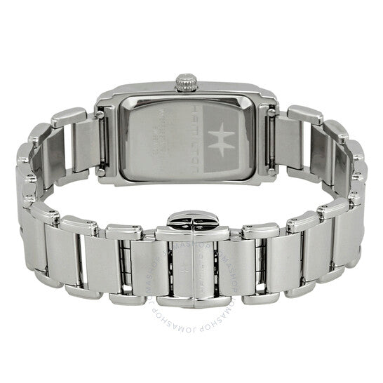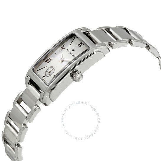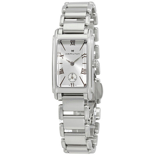 علبة من الفولاذ المقاوم للصدأ مع سوار من الفولاذ المقاوم للصدأ. إطار ثابت من الفولاذ المقاوم للصدأ. ميناء فضي اللون بعقارب فضية اللون وأرقام رومانية متناوبة وعلامات ساعات. نوع الميناء: تناظري. ميناء فرعي للثواني الصغيرة عند موضع الساعة السادسة. حركة كوارتز عيار ETA 980.153. زجاج معدني مقاوم للخدش. تاج قابل للسحب/الدفع. غطاء خلفي صلب. شكل مستطيل. أبعاد العلبة: 18.7 مم × 27 مم. سمك العلبة: 6.9 مم. عرض السوار: 14 مم. مشبك قابل للطي. مقاومة للماء حتى عمق 30 مترًا / 100 قدم. الوظائف: الساعات، الدقائق، الثواني الصغيرة، مؤشر عمر البطارية. تصميم كاجوال. علامة الساعة: صناعة سويسرية. ساعة هاميلتون أردمور نسائية بمينا فضي H11221114.