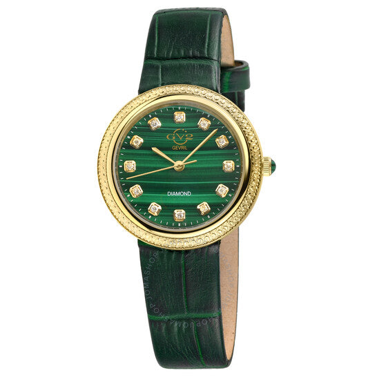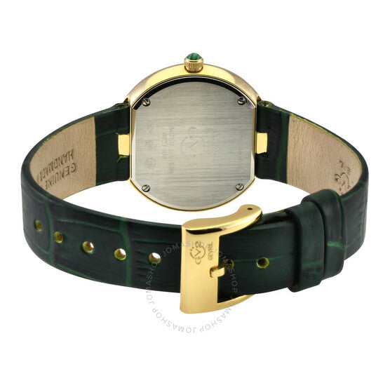 علبة من الفولاذ المقاوم للصدأ بلون الذهب الأصفر مع سوار جلدي أخضر. إطار ثابت من الفولاذ المقاوم للصدأ بلون الذهب الأصفر. ميناء أخضر بعقارب ذهبية اللون وعلامات ساعات مرصعة بالألماس. علامات دقائق حول الحافة الخارجية. نوع الميناء: تناظري. حركة كوارتز. زجاج ياقوت مقاوم للخدش. تاج قابل للسحب/الدفع. غطاء خلفي صلب. شكل دائري، مقاس العلبة: 33 مم، سمكها: 8.5 مم. عرض السوار: 16 مم. مشبك بإبزيم. مقاومة للماء حتى عمق 50 مترًا / 165 قدمًا. الوظائف: الساعات، الدقائق، الثواني. معلومات إضافية: 12 ماسة، ميناء من المالشايت الأخضر، كابوشون، والتاج. سلسلة أريزو. ساعة أنيقة. GV2 من جيفريل أريزو كوارتز نسائية بمينا خضراء مرصعة بالألماس، طراز 13302.