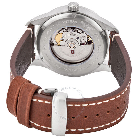 علبة من الفولاذ المقاوم للصدأ مع سوار جلدي بني. إطار دوار ثنائي الاتجاه من الفولاذ المقاوم للصدأ. ميناء أزرق بعقارب سوداء وعلامات ساعات بأرقام عربية. علامات ٢٤ ساعة. مقياس سرعة الدوران حول الحافة الخارجية. نوع الميناء: تناظري. عقارب وعلامات مضيئة. عرض التاريخ عند موضع الساعة السادسة. حركة أوتوماتيكية من عيار Sellita SW200، تحتوي على ٢٦ جوهرة، تنبض بمعدل ٢٨٨٠٠ ذبذبة في الساعة، ولديها احتياطي طاقة يدوم حوالي ٣٨ ساعة. زجاج ياقوت مقاوم للخدش. غطاء خلفي شفاف. شكل دائري. حجم العلبة: ٤٢ مم. سمكها: ١١ مم. عرض السوار: ٢٢ مم. مشبك قابل للطي. مقاومة للماء حتى عمق ١٠٠ متر / ٣٣٠ قدمًا. الوظائف: التاريخ، الساعة، الدقيقة، الثانية. طراز الساعة العسكرية. علامة الساعة: صناعة سويسرية. ساعة Victorinox Ariboss أوتوماتيكية للرجال بمينا أزرق رقم ٢٤١٨٨٧.