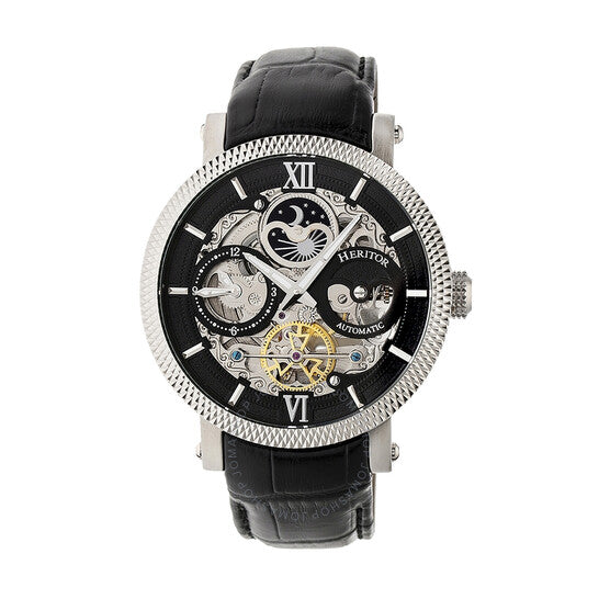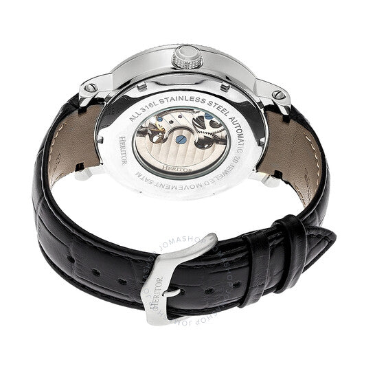 علبة من الفولاذ المقاوم للصدأ مع سوار جلدي أسود. إطار ثابت من الفولاذ المقاوم للصدأ. ميناء أسود (هيكلي مركزي) بعقارب فضية اللون وعلامات ساعات. أرقام رومانية عند موضعي الساعة 6 و12. نوع الميناء: تناظري. عقارب مضيئة. ميناءان فرعيان يعرضان: طور القمر و24 ساعة. حركة أوتوماتيكية باحتياطي طاقة 42 ساعة. كريستال معدني مقاوم للخدش مطلي بالياقوت. تاج قابل للسحب/الدفع. غطاء خلفي شفاف. شكل دائري. حجم العلبة: 43 مم. سمكها: 16 مم. عرض السوار: 20 مم. مشبك تانغ. مقاومة للماء حتى عمق 50 مترًا / 165 قدمًا. الوظائف: الساعات، الدقائق، الثواني، طور القمر، التوقيت المزدوج. سلسلة أريس. ساعة رسمية. ساعة هيريتور أريس الأوتوماتيكية للرجال HR4405 بمينا هيكلي أسود.