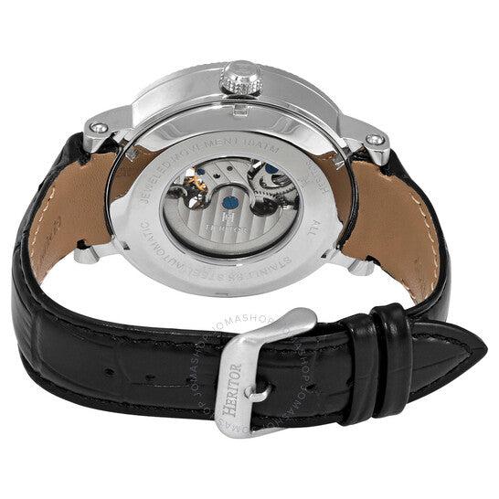 علبة من الفولاذ المقاوم للصدأ مع سوار جلدي أسود (منقوش بنقش جلد التمساح). إطار ثابت من الفولاذ المقاوم للصدأ. ميناء فضي (هيكلي مركزي) بعقارب رمادية مضيئة ومؤشرات ساعات. أرقام رومانية تُشير إلى موضعي الساعة 6 و12. نوع الميناء: تناظري. عقارب مضيئة. ميناءان فرعيان يعرضان: طور القمر و24 ساعة. حركة أوتوماتيكية باحتياطي طاقة لمدة 42 ساعة. زجاج معدني مقاوم للخدش مطلي بالياقوت. غطاء خلفي شفاف. شكل دائري. حجم العلبة: 43 مم. سمكها: 16 مم. عرض السوار: 22 مم. مشبك تانغ. مقاومة للماء حتى عمق 50 مترًا / 165 قدمًا. الوظائف: الساعات، الدقائق، الثواني، طور القمر، التوقيت المزدوج. معلومات إضافية: متوسط معدل الكسب/الخسارة: +/- 45 ثانية يوميًا. سلسلة أريس. ساعة رسمية. ساعة هيريتور أريس أوتوماتيكية فضية بمينا هيكلي للرجال HR4404.
