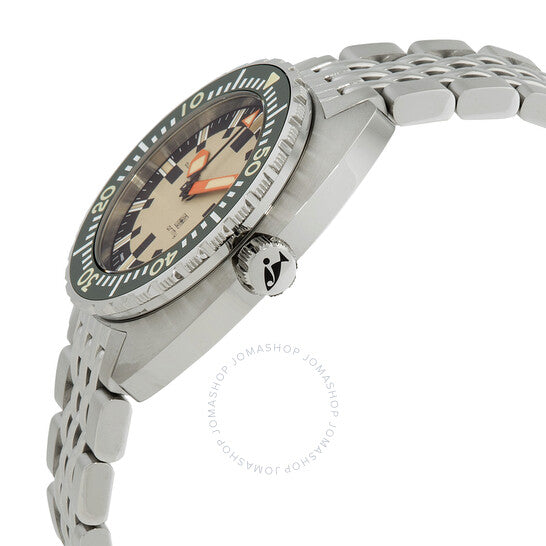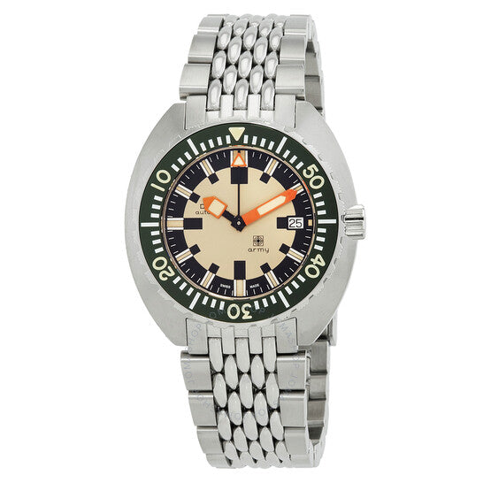 علبة وسوار من الفولاذ المقاوم للصدأ فضي اللون. إطار دوار أحادي الاتجاه من السيراميك الأخضر. ميناء بيج مع عقارب مضيئة ومؤشرات ساعات. مؤشرات دقائق حول الحافة الخارجية. نوع الميناء: تناظري. عقارب ومؤشرات مضيئة. عرض التاريخ عند موضع الساعة الثالثة. حركة أوتوماتيكية ETA عيار 2824، تحتوي على 25 جوهرة، تنبض بمعدل 28800 ذبذبة في الساعة، ولديها احتياطي طاقة يدوم حوالي 38 ساعة. زجاج من الياقوت المقاوم للخدش. تاج لولبي. غطاء خلفي صلب. شكل العلبة دائري، أبعادها: 42.50 مم × 44.50 مم، سمكها: 11.92 مم. عرض السوار: 20 مم. مشبك قابل للطي. مقاومة للماء حتى عمق 300 متر / 1000 قدم. الوظائف: التاريخ، الساعة، الدقائق، الثواني. سلسلة الجيش. طراز الساعة الرياضية. علامة الساعة: صناعة سويسرية. ساعة دوكسا آرمي أوتوماتيكية للرجال 785.10.031G.10.