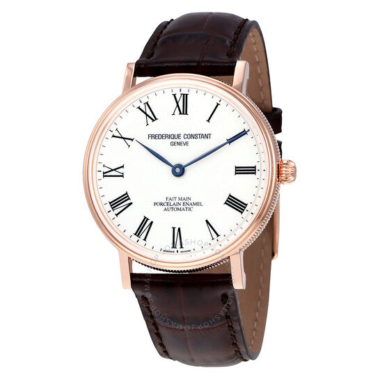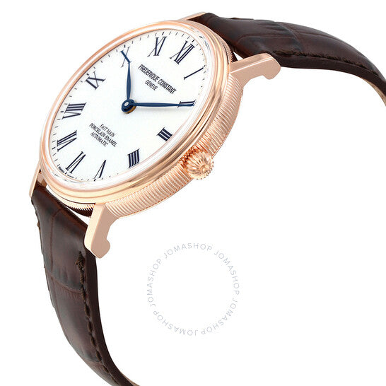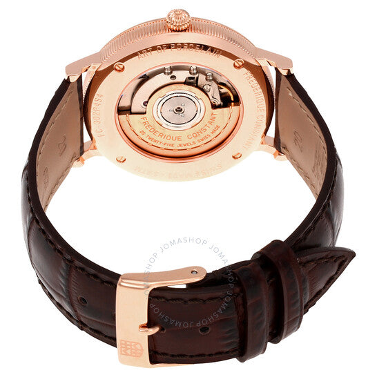 علبة من الفولاذ المقاوم للصدأ مطلية بالذهب الوردي مع سوار من جلد التمساح البني. إطار ثابت مطلي بالذهب الوردي. ميناء من مينا البورسلين الأبيض بعقارب زرقاء وعلامات ساعات رومانية. علامات دقائق حول الحافة الخارجية. نوع الميناء: تناظري. حركة أوتوماتيكية من عيار فريدريك كونستانت FC302 مع احتياطي طاقة لمدة 38 ساعة. زجاج ياقوت مقاوم للخدش. غطاء خلفي شفاف. حجم العلبة: 39 مم. سمكها: 8 مم. شكلها دائري. عرض السوار: 20 مم. طول السوار: 7.85 بوصة. مشبك تانغ. مقاومة للماء حتى عمق 30 مترًا / 100 قدم. الوظائف: الساعات، الدقائق. تصميم ساعة فاخرة. ساعة فريدريك كونستانت الأوتوماتيكية للرجال FC-302P4S4.