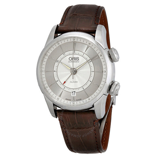علبة من الفولاذ المقاوم للصدأ فضية اللون مع سوار من جلد التمساح البني الداكن. إطار ثابت من الفولاذ المقاوم للصدأ. ميناء فضي ورمادي مع عقارب ومؤشرات ساعات فضية اللون. نوع الميناء: تناظري. عقارب ومؤشرات مضيئة. عرض التاريخ عند موضع الساعة السادسة. عيار أوريس 908، حركة أوتوماتيكية LJP5800/AS 5008 أساسية مع احتياطي طاقة لمدة 45 ساعة. زجاج ياقوت مقاوم للخدش. غطاء خلفي شفاف. شكل العلبة دائري. حجم العلبة: 42.50 مم. عرض السوار: 22 مم. مشبك قابل للطي. مقاومة للماء حتى عمق 30 مترًا / 100 قدم. الوظائف: منبه، تاريخ، ساعة، دقيقة، ثانية. طراز ساعة رسمية. علامة الساعة: صناعة سويسرية. إصدارات المنتج: 01 908 7607 4091 Set LS، 01 908 7607 4091.Set.LS، 01 908 7607 4091SetLS. ساعة أوريس أرتيليه ألمَر أوتوماتيكية للرجال بمينا فضية، 01 908 7607 4091-Set-LS.