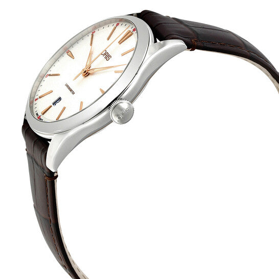 علبة من الفولاذ المقاوم للصدأ مع سوار من جلد العجل البني. إطار ثابت من الفولاذ المقاوم للصدأ. ميناء فضي مزخرف بنقشة غيوشيه مع عقارب مضيئة بلون الذهب الوردي وعلامات ساعات. علامات دقائق بأرقام عربية (بفاصل ٥ دقائق). علامات دقائق حول الحافة الخارجية. نوع الميناء: تناظري. عقارب مضيئة. عرض التاريخ عند موضع الساعة السادسة. حركة أوريس أوتوماتيكية عيار ٧٣٧ مع احتياطي طاقة ٣٨ ساعة. زجاج معدني مقاوم للخدش. تاج لولبي. غطاء خلفي شفاف. حجم العلبة: ٤٠ مم. سمكها: ١١.٥ مم. شكلها دائري. عرض السوار: ٢١ مم. مشبك قابل للطي. مقاومة للماء حتى عمق ٣٠ مترًا / ١٠٠ قدم. الوظائف: التاريخ، الساعة، الدقيقة، الثانية. تصميم ساعة كاجوال. علامة الساعة: صناعة سويسرية. ساعة أوريس أرتيليه أوتوماتيكية للرجال بمينا فضي ٠١ ٧٣٧ ٧٧٢١ ٤٠٣١-٠٧ ٥ ٢١ ٦٥FC