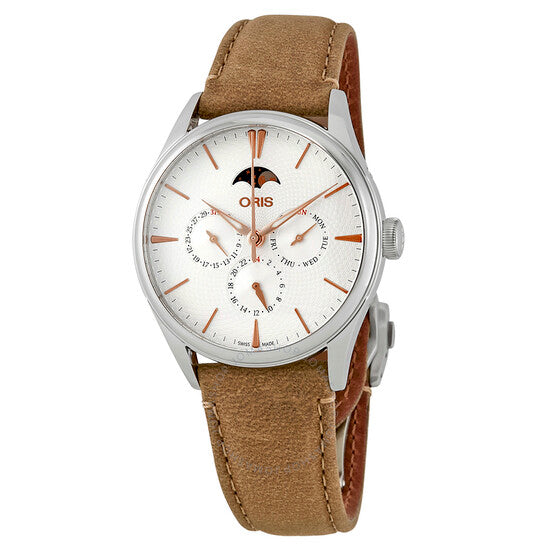 علبة من الفولاذ المقاوم للصدأ مع سوار جلدي بني فاتح. إطار ثابت من الفولاذ المقاوم للصدأ. ميناء فضي اللون مع عقارب وعلامات ساعات ذهبية وردية. علامات دقائق حول الحافة الخارجية. نوع الميناء: تناظري. عقارب وعلامات مضيئة. نافذة عرض التاريخ عند موضع الساعة التاسعة. ثلاثة تواريخ، يوم الأسبوع، و٢٤ ساعة. ميناء فرعي لعرض أطوار القمر. حركة أوريس ٧٨١، قاعدة SW ٢٠٠-١ أوتوماتيكية، مع احتياطي طاقة ٣٨ ساعة. زجاج ياقوت مقاوم للخدش. تاج قابل للسحب/الدفع. غطاء خلفي شفاف. شكل دائري. حجم العلبة: ٤٠ مم. عرض السوار: ٢١ مم. مشبك قابل للطي. مقاومة للماء حتى عمق ٥٠ مترًا / ١٦٥ قدمًا. الوظائف: التاريخ، اليوم، الساعة، الدقيقة، الثانية، أطوار القمر. طراز ساعة رسمية. علامة الساعة: صناعة سويسرية. ساعة أوريس أرتيلير كومبليكيشن أوتوماتيكية للرجال بمينا فضي 01 781 7729 4031-07 5 21 32FC.