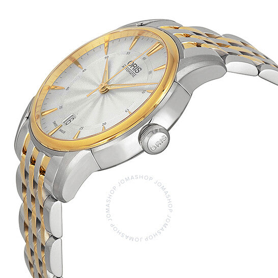 علبة من الفولاذ المقاوم للصدأ مع سوار من الفولاذ المقاوم للصدأ ثنائي اللون (فضي وذهبي أصفر مطلي بتقنية PVD). إطار ثابت من الذهب الأصفر مطلي بتقنية PVD. ميناء فضي مع عقارب وعلامات ساعات مضيئة من الذهب الأصفر. علامات دقائق حول الحافة الخارجية. نوع الميناء: تناظري. عقارب وعلامات مضيئة. عرض التاريخ عند موضع الساعة السادسة. حركة أوريس أوتوماتيكية عيار 733 مع احتياطي طاقة لمدة 38 ساعة. زجاج من الياقوت المقاوم للخدش. تاج قابل للسحب/الدفع. غطاء خلفي هيكلي. شكل دائري. حجم العلبة: 40 مم. سمكها: 11.1 مم. عرض السوار: 21 مم. مشبك قابل للطي. مقاومة للماء حتى عمق 30 مترًا / 100 قدم. الوظائف: التاريخ، الساعة، الدقائق، الثواني. تصميم كاجوال. علامة الساعة: صناعة سويسرية. ساعة أوريس أرتيليه ديت أوتوماتيكية للرجال بمينا فضي 01 733 7670 4351-07 8 21 78.
