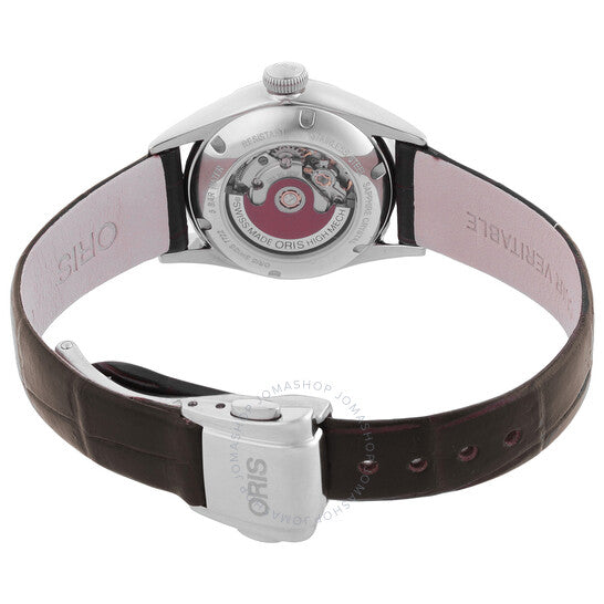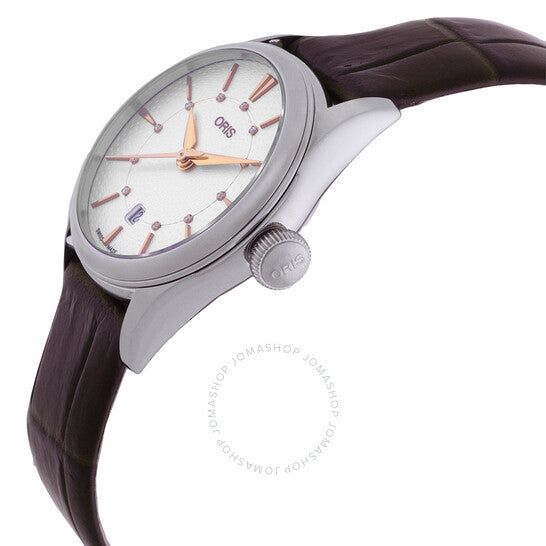 علبة فضية اللون من الفولاذ المقاوم للصدأ مع سوار بني من جلد التمساح. إطار ثابت من الفولاذ المقاوم للصدأ فضي اللون. ميناء فضي اللون مع عقارب ذهبية اللون وعلامات ساعات. علامات دقائق حول الحافة الخارجية. نوع الميناء: تناظري. عرض التاريخ عند موضع الساعة السادسة. أوريس كاليبر 561، حركة أوتوماتيكية، مبنية على ETA 2671، تحتوي على 25 جوهرة، تنبض بمعدل 28800 ذبذبة في الساعة، ولديها احتياطي طاقة يدوم حوالي 38 ساعة. كريستال ياقوت مقاوم للخدش ومقاوم للانعكاس. تاج قابل للسحب/الدفع. غطاء خلفي شفاف. شكل العلبة دائري، مقاسها 28 مم. مشبك قابل للطي. مقاومة للماء حتى عمق 50 مترًا / 164 قدمًا. الوظائف: التاريخ، الساعة، الدقائق، الثواني. سلسلة أرتيليه. طراز ساعة رسمية. علامة الساعة: صناعة سويسرية. ساعة أوريس أرتيلير ديت مرصعة بالألماس 01 561 7722 4031-07 5 14 65FC.