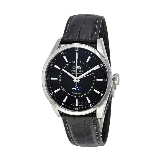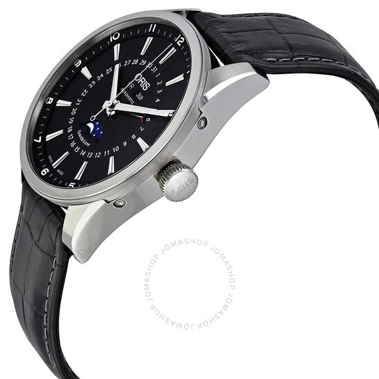 علبة من الفولاذ المقاوم للصدأ مع سوار جلدي أسود. إطار ثابت من الفولاذ المقاوم للصدأ. ميناء أسود بعقارب فضية مضيئة ومؤشرات ساعات رقمية عربية. عداد تاريخ حول حلقة داخلية (تاريخ المؤشر). مؤشرات دقائق حول الحافة الخارجية. نوع الميناء: تناظري. عقارب ومؤشرات مضيئة. عرض يوم الأسبوع والشهر فوق الميناء المركزي. أطوار القمر. حركة أوريس أوتوماتيكية عيار 915 مع احتياطي طاقة لمدة 38 ساعة. كريستال ياقوت مقاوم للخدش. تاج قابل للسحب/الدفع. غطاء خلفي من كريستال معدني شفاف. حجم العلبة: 42 مم. شكل دائري. عرض السوار: 21 مم. مشبك قابل للطي. مقاومة للماء حتى عمق 100 متر / 330 قدمًا. الوظائف: الساعات، الدقائق، الثواني، مؤشر التاريخ، وأطوار القمر. تصميم ساعة فاخرة. علامة الساعة: صناعة سويسرية. ساعة أوريس أرتيكس كومبليكشن مون فيز أوتوماتيكية للرجال 915-7643-4034LS.