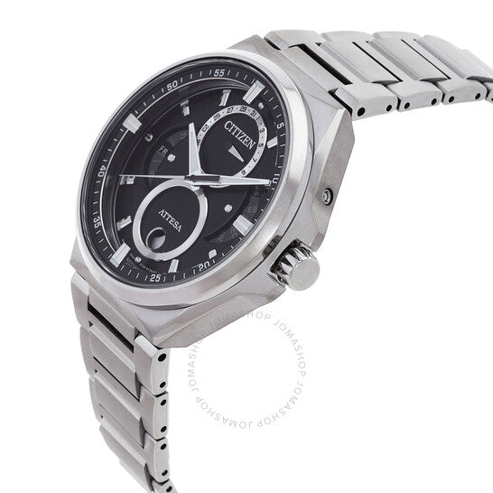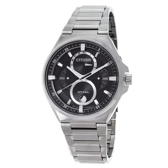 علبة وسوار من التيتانيوم الفائق فضي اللون. إطار ثابت من التيتانيوم الفائق فضي اللون. ميناء أسود بعقارب فضية اللون وعلامات ساعات. علامات دقائق حول الحافة الخارجية. نوع الميناء: تناظري. أربعة أقراص فرعية تعرض: الشهر، التاريخ، اليوم، وأطوار القمر. حركة سيتيزن كاليبر إيكو-درايف 8730 إيكو-درايف. كريستال ياقوتي مقاوم للخدش. غطاء خلفي صلب. شكل دائري، مقاس العلبة: 42 مم. مشبك قابل للطي مع مفتاح أمان. مقاومة للماء حتى عمق 100 متر / 330 قدم. الوظائف: طور القمر، الشهر، التاريخ، اليوم، الساعة، الدقيقة، الثانية، تعمل بالطاقة الشمسية. سلسلة أتيسا. طراز ساعة رياضية. علامة الساعة: Japan Movt. ساعة سيتيزن أتيسا مون فيز للرجال بمينا أسود، BU0060-68E.