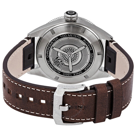 علبة من الفولاذ المقاوم للصدأ فضية اللون مع سوار جلدي بني. إطار أسود. ميناء أسود دخاني مع عقارب فضية اللون وعلامات ساعات بأرقام عربية. علامات دقائق حول الحافة الخارجية. نوع الميناء: تناظري. عرض التاريخ عند موضع الساعة السادسة. آلية حركة أوتوماتيكية. زجاج ياقوت مقاوم للخدش. غطاء خلفي صلب. شكل دائري. حجم العلبة: 42 مم. مقاومة للماء حتى عمق 100 متر / 330 قدمًا. الوظائف: التاريخ، الساعة، الدقائق، الثواني. علامة الساعة: صناعة سويسرية. ساعة تاغ هوير أوتافيا أوتوماتيكية للرجال WBE5110.FC6266.