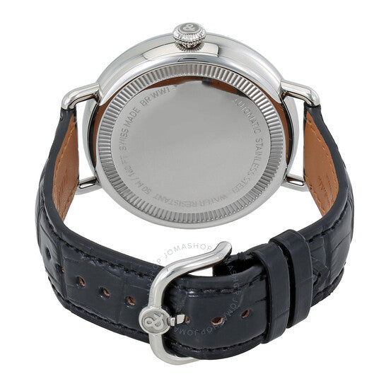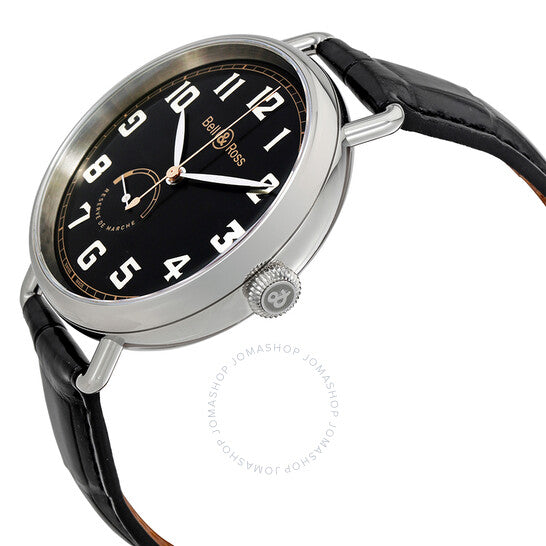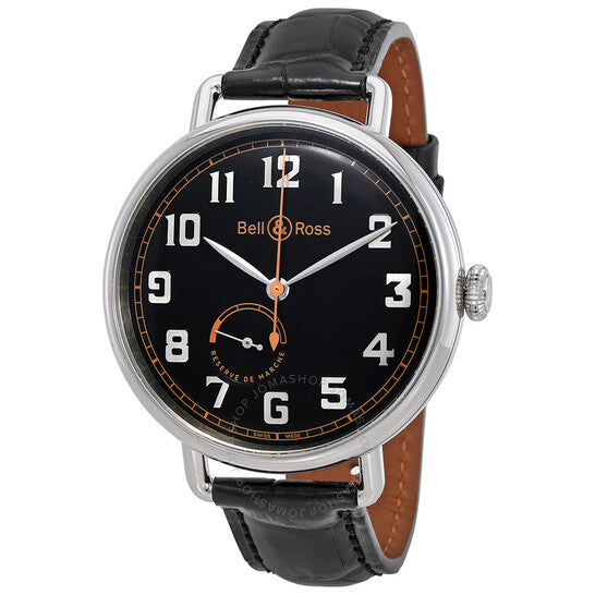 علبة من الفولاذ المقاوم للصدأ مع سوار أسود من جلد التمساح. إطار ثابت من الفولاذ المقاوم للصدأ. ميناء أسود بعقارب فضية اللون وعلامات ساعات بأرقام عربية. علامات دقائق حول الحافة الخارجية. نوع الميناء: تناظري. موانئ فرعية لمؤشر احتياطي الطاقة. حركة أوتوماتيكية من بيل آند روس، عيار BR-CAL.307، باحتياطي طاقة لمدة 42 ساعة. زجاج من الياقوت المقاوم للخدش. غطاء خلفي صلب. شكل دائري. حجم العلبة: 45 مم. سمكها: 13 مم. عرض السوار: 18 مم. مشبك تانغ. مقاومة للماء حتى عمق 50 مترًا / 165 قدمًا. الوظائف: الساعات، الدقائق، الثواني، احتياطي الطاقة. سلسلة تراث الحرب العالمية الأولى العتيقة. تصميم ساعة فاخرة. علامة الساعة: صناعة سويسرية. ساعة بيل آند روس أوتوماتيكية للرجال بمينا أسود، BRWW197-HER-ST/SCR.