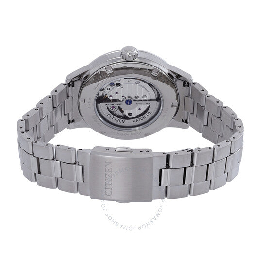 علبة وسوار من الفولاذ المقاوم للصدأ فضي اللون. إطار ثابت من الفولاذ المقاوم للصدأ فضي اللون. ميناء أسود بعقارب فضية اللون وعلامات ساعات. نوع الميناء: تناظري. علامات مضيئة. عرض التاريخ عند موضع الساعة 3. حركة أوتوماتيكية 8310. زجاج معدني مقاوم للخدش. تاج قابل للسحب/الدفع. غطاء خلفي شفاف. شكل العلبة دائري، مقاسها 41 مم. مشبك قابل للطي بزر ضغط. مقاومة للماء حتى عمق 50 مترًا / 165 قدمًا. الوظائف: التاريخ، الساعة، الدقائق، الثواني. ساعة سيتيزن أوتوماتيكية للرجال بمينا أسود NK0000-95E.
