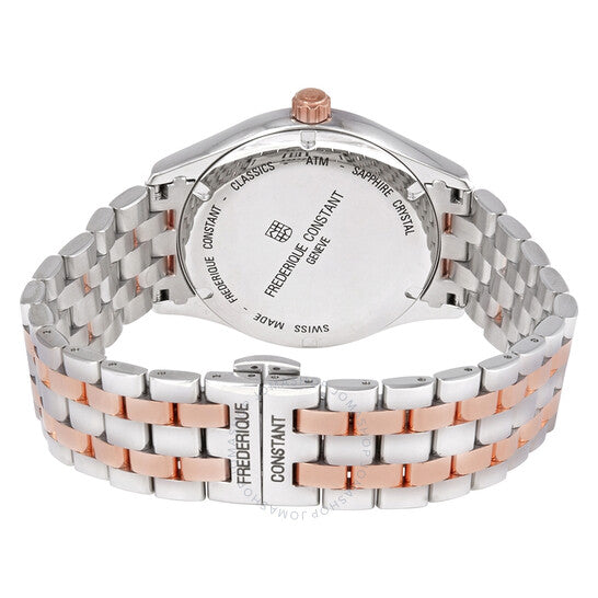 علبة من الفولاذ المقاوم للصدأ بلونين (فضي وذهبي وردي) مع سوار من الفولاذ المقاوم للصدأ بلونين (فضي وذهبي وردي). إطار ثابت بلون ذهبي وردي. ميناء أزرق مع عقارب ومؤشرات ساعات بلون ذهبي وردي. نوع الميناء: تناظري. عرض التاريخ عند موضع الساعة 3. حركة أوتوماتيكية. زجاج ياقوت مقاوم للخدش. شكل العلبة دائري. حجم العلبة: 40 مم. مشبك قابل للطي. مقاومة للماء حتى عمق 50 مترًا / 165 قدمًا. الوظائف: التاريخ، الساعة، الدقيقة، الثانية. طراز ساعة رسمية. علامة الساعة: صناعة سويسرية. ساعة فريدريك كونستانت أوتوماتيكية للرجال بمينا أزرق، ثنائية اللون، FC-303LN5B2B.