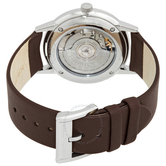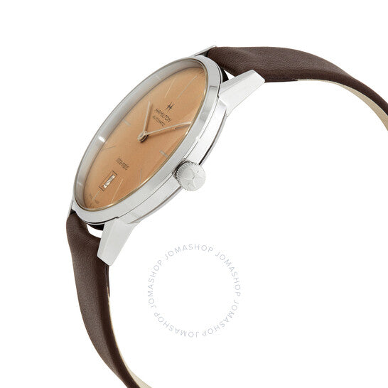 علبة من الفولاذ المقاوم للصدأ مع سوار من جلد العجل البني. إطار ثابت من الفولاذ المقاوم للصدأ. ميناء بلون الشمبانيا مع عقارب وعلامات ساعات فضية اللون. علامات دقائق حول الحافة الخارجية. نوع الميناء: تناظري. نافذة لعرض التاريخ فوق موضع الساعة السادسة. حركة أوتوماتيكية من عيار 2892-A2 مع احتياطي طاقة يصل إلى 50 ساعة. زجاج من الياقوت المقاوم للخدش. تاج قابل للسحب/الدفع. غطاء خلفي شفاف. شكل دائري. حجم العلبة: 38 مم. سمكها: 10 مم. عرض السوار: 20 مم. مشبك تانغ. مقاومة للماء حتى عمق 50 مترًا / 165 قدمًا. الوظائف: التاريخ، الساعة، الدقائق، الثواني. تصميم كاجوال. علامة الساعة: صناعة سويسرية. ساعة هاميلتون أوتوماتيكية للرجال بمينا بلون الشمبانيا H38455501.