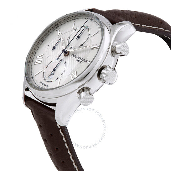 علبة من الفولاذ المقاوم للصدأ مع سوار جلدي بني داكن. إطار ثابت من الفولاذ المقاوم للصدأ. ميناء فضي مع عقارب مضيئة فضية اللون على شكل حرف ألفا، وأرقام رومانية متناوبة وعلامات ساعات. علامات دقائق حول الحافة الخارجية. نوع الميناء: تناظري. عقارب مضيئة. عرض التاريخ عند موضع الساعة السادسة. كرونوغراف - ثلاثة أقراص فرعية تعرض: 60 ثانية، 30 دقيقة، و12 ساعة. حركة أوتوماتيكية من عيار فريدريك كونستانت FC-392، مبنية على ETA 7750، تحتوي على 25 جوهرة، تنبض بمعدل 28800 ذبذبة في الساعة، ولديها احتياطي طاقة لمدة 42 ساعة تقريبًا. زجاج ياقوت مقاوم للخدش. غطاء خلفي شفاف. شكل دائري. حجم العلبة: 42 مم. سمك العلبة: 10 مم. عرض السوار: 20 مم. مشبك تانغ. مقاومة للماء حتى عمق 50 مترًا / 165 قدمًا. الوظائف: كرونوغراف، تاريخ، ساعة، دقيقة، ثانية. طراز ساعة رسمية. علامة الساعة: صناعة سويسرية. ساعة فريدريك كونستانت أوتوماتيكية كرونوغراف للرجال FC-392MS5B6.