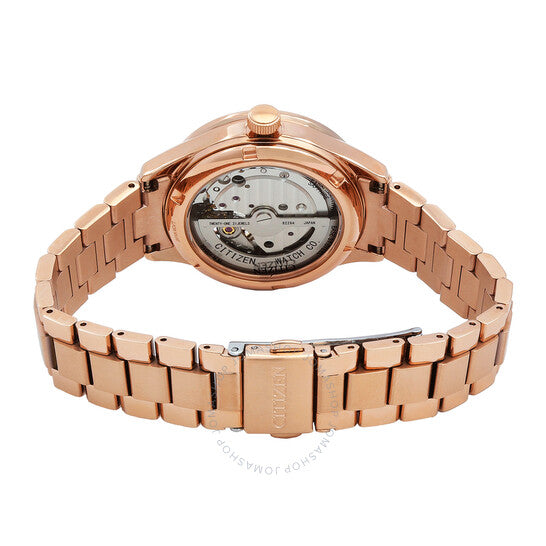 علبة وسوار من الفولاذ المقاوم للصدأ بلون الذهب الوردي. إطار ثابت من الفولاذ المقاوم للصدأ بلون الذهب الوردي. ميناء أبيض بعقارب بلون الذهب الوردي وعلامات ساعات بأرقام رومانية من الكريستال. علامات دقائق حول الحافة الخارجية. نوع الميناء: تناظري. حركة أوتوماتيكية من سيتيزن كاليبر 8229. زجاج ياقوتي مقاوم للخدش. غطاء خلفي شفاف. شكل العلبة دائري، مقاسها: 34 مم، سمكها: 11.1 مم. مشبك قابل للطي مع مفتاح أمان. مقاومة للماء حتى عمق 100 متر / 330 قدمًا. الوظائف: الساعات، الدقائق، الثواني. طراز ساعة رسمية. علامة الساعة: Japan Movt. ساعة سيتيزن أوتوماتيكية نسائية بمينا كريستال أبيض PC1017-70Y.