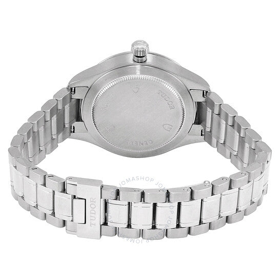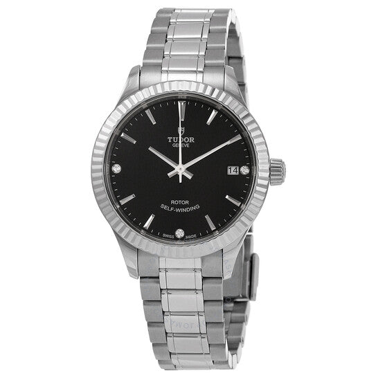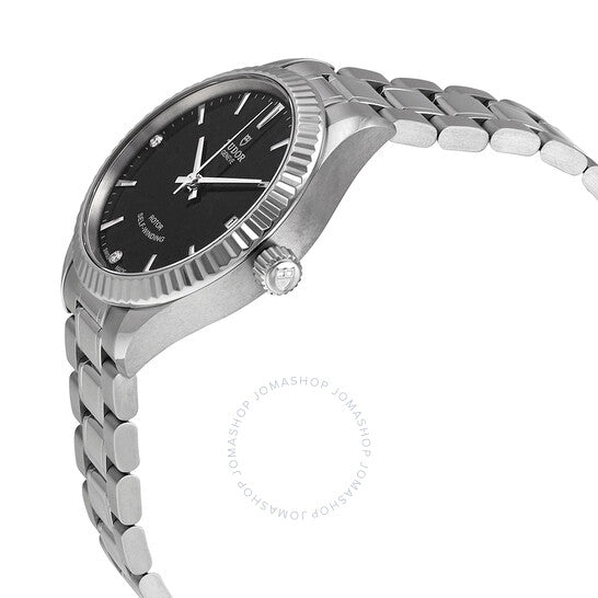 علبة من الفولاذ المقاوم للصدأ مع سوار من الفولاذ المقاوم للصدأ. إطار ثابت مُخدّد من الفولاذ المقاوم للصدأ. ميناء أسود بعقارب فضية اللون وعلامات ساعات. مرصع بالألماس عند الساعة 3 و6 و9. نوع الميناء: تناظري. عرض التاريخ عند الساعة 3. حركة أوتوماتيكية من عيار تيودور T601، مبنية على ETA 2824، تحتوي على 25 جوهرة، تنبض بتردد 28800 ذبذبة في الساعة، وتتمتع باحتياطي طاقة يدوم حوالي 38 ساعة. زجاج من الياقوت المقاوم للخدش. تاج لولبي. شكل العلبة دائري. حجمها: 34 مم. مشبك قابل للطي. مقاومة للماء حتى عمق 100 متر / 330 قدمًا. الوظائف: التاريخ، الساعة، الدقائق، الثواني. طراز ساعة رسمية. علامة الساعة: صناعة سويسرية. ساعة تيودور أوتوماتيكية نسائية بمينا أسود مرصعة بالألماس M12310-0009.