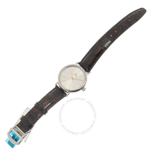 علبة من الفولاذ المقاوم للصدأ مع سوار من جلد التمساح البني الداكن. إطار ثابت من الفولاذ المقاوم للصدأ. ميناء فضي مع عقارب من الذهب الوردي وعلامات ساعات مرصعة بالألماس. أرقام رومانية عند موضعي الساعة 6 و12. علامات دقائق حول الحافة الخارجية. نوع الميناء: تناظري. حركة أوتوماتيكية من عيار IWC 35100، مبنية على Sellita SW300-1، تحتوي على 25 جوهرة، مكونة من 148 جزءًا، تنبض بمعدل 28800 ذبذبة في الساعة، ولديها احتياطي طاقة لمدة 42 ساعة تقريبًا. زجاج ياقوت مقاوم للخدش. تاج قابل للسحب/الدفع. غطاء خلفي صلب. شكل دائري. حجم العلبة: 34 مم. سمك العلبة: 8.6 مم. عرض السوار: 16 مم. مشبك قابل للطي. مقاومة للماء حتى عمق 30 مترًا / 99 قدمًا. الوظائف: الساعة، الدقيقة، الثانية. تصميم ساعة فاخر. ملصق الساعة: صناعة سويسرية. ساعة IWC أوتوماتيكية مرصعة بالألماس ومينا فضي للسيدات IW357403.