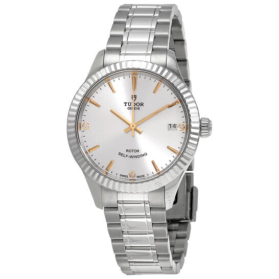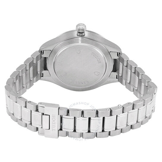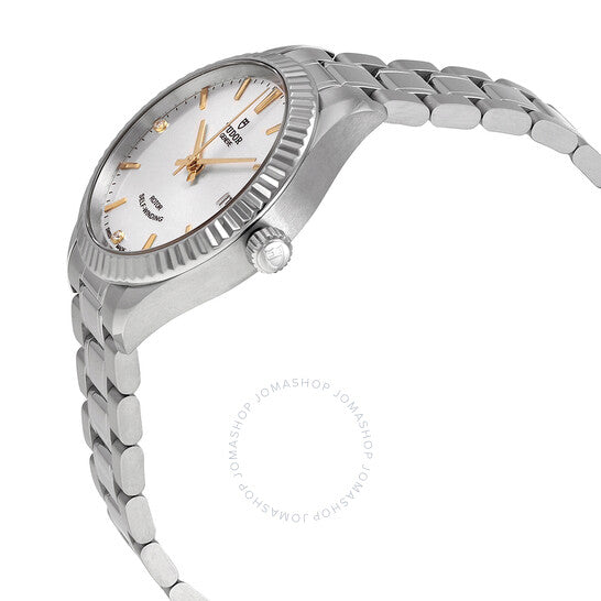 علبة من الفولاذ المقاوم للصدأ مع سوار من الفولاذ المقاوم للصدأ. إطار ثابت مُخدّد من الفولاذ المقاوم للصدأ. ميناء فضي اللون بعقارب ذهبية اللون وعلامات ساعات. مرصعة بالألماس عند الساعة 3 و6 و9. علامات دقائق حول الحافة الخارجية. نوع الميناء: تناظري. عرض التاريخ عند الساعة 3. حركة أوتوماتيكية من عيار T601 مع احتياطي طاقة لمدة 38 ساعة. زجاج ياقوت مقاوم للخدش. تاج لولبي. غطاء خلفي صلب. شكل دائري. حجم العلبة: 34 مم. مشبك قابل للطي. مقاومة للماء حتى عمق 100 متر / 330 قدمًا. الوظائف: التاريخ، الساعة، الدقائق، الثواني. طراز ساعة رسمية. علامة الساعة: صناعة سويسرية. ساعة تيودور أوتوماتيكية نسائية بمينا فضي مرصعة بالألماس M12310-0011.