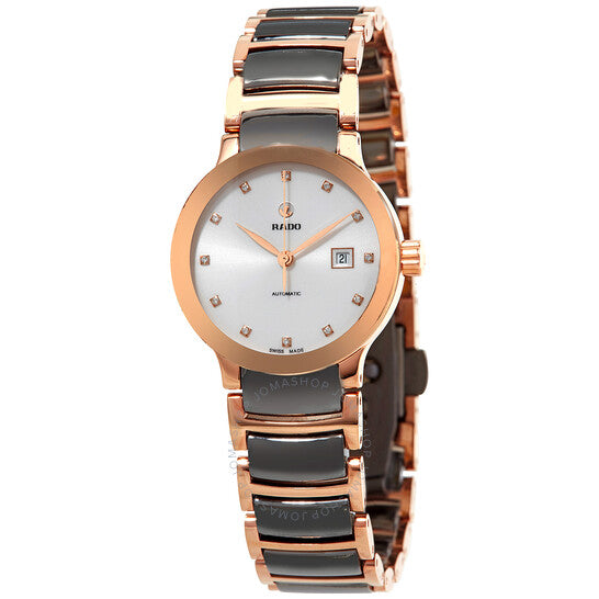 علبة من الفولاذ المقاوم للصدأ مطلية بالذهب الوردي بتقنية PVD، وسوار من الفولاذ المقاوم للصدأ مطلي بالذهب الوردي بتقنية PVD مع سيراميك بلازما (عالي التقنية). إطار ثابت من الفولاذ المقاوم للصدأ مطلي بالذهب الوردي بتقنية PVD. ميناء فضي اللون مع عقارب بلون الذهب الوردي وعلامات ساعات من الألماس. نوع الميناء: تناظري. عرض التاريخ عند موضع الساعة 3. حركة أوتوماتيكية باحتياطي طاقة لمدة 38 ساعة. زجاج من الياقوت المقاوم للخدش. تاج قابل للسحب/الدفع. غطاء خلفي شفاف. شكل دائري، مقاس العلبة: 28 مم، سمكها: 9.3 مم. مشبك قابل للطي. مقاومة للماء حتى عمق 30 مترًا / 100 قدم. الوظائف: التاريخ، الساعة، الدقائق، الثواني. سلسلة Centrix. تصميم كاجوال. علامة الساعة: صناعة سويسرية. ساعة رادو أوتوماتيكية نسائية بمينا فضي مرصع بالألماس، R30183762.