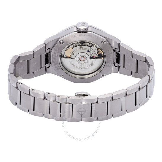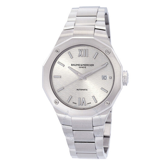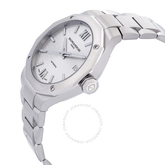 علبة وسوار من الفولاذ المقاوم للصدأ فضي اللون. إطار ثابت من الفولاذ المقاوم للصدأ فضي اللون. ميناء فضي اللون مع عقارب فضية اللون ومؤشرات ساعات بأرقام رومانية. نوع الميناء: تناظري. عرض التاريخ عند موضع الساعة 3. حركة أوتوماتيكية من طراز Sellita Caliber SW200، تحتوي على 26 جوهرة، تنبض بمعدل 28800 ذبذبة في الساعة، وتحتفظ باحتياطي طاقة يدوم حوالي 38 ساعة. زجاج ياقوت مقاوم للخدش. غطاء خلفي شفاف. حجم العلبة: 36 مم، سمكها: 9.57 مم. مشبك قابل للطي. مقاومة للماء حتى عمق 50 مترًا / 165 قدمًا. الوظائف: التاريخ، الساعة، الدقائق، الثواني. سلسلة ريفييرا. اسم الساعة: صناعة سويسرية. ساعة بوم إيه ميرسييه أوتوماتيكية نسائية M0A10615.