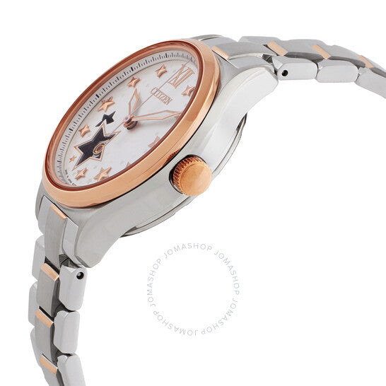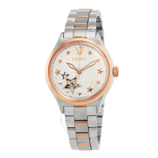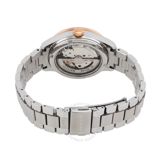 علبة من الفولاذ المقاوم للصدأ فضية اللون، مع سوار من الفولاذ المقاوم للصدأ ثنائي اللون (فضي وذهبي وردي). إطار ثابت من الفولاذ المقاوم للصدأ ذهبي وردي. عقارب وعلامات ساعات بأرقام رومانية ذهبية اللون. علامات دقائق حول الحافة الخارجية. نوع الميناء: تناظري. عقارب مضيئة. حركة أوتوماتيكية سيتيزن كاليبر 8229. زجاج ياقوت مقاوم للخدش. غطاء خلفي شفاف. شكل العلبة دائري، مقاسها: 34 مم، سمكها: 11.1 مم. مشبك قابل للطي بزر ضغط. مقاومة للماء حتى عمق 100 متر / 330 قدمًا. الوظائف: الساعات، الدقائق، الثواني. طراز ساعة رسمية. ملصق الساعة: Japan Movt. ساعة سيتيزن أوتوماتيكية نسائية PC1009-78B.