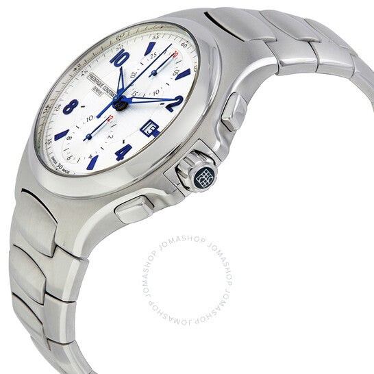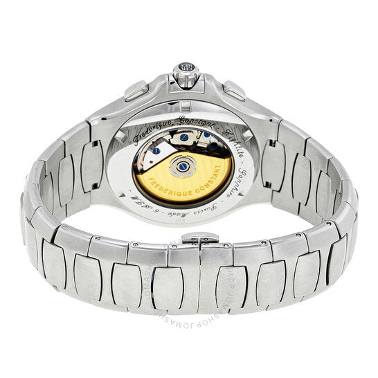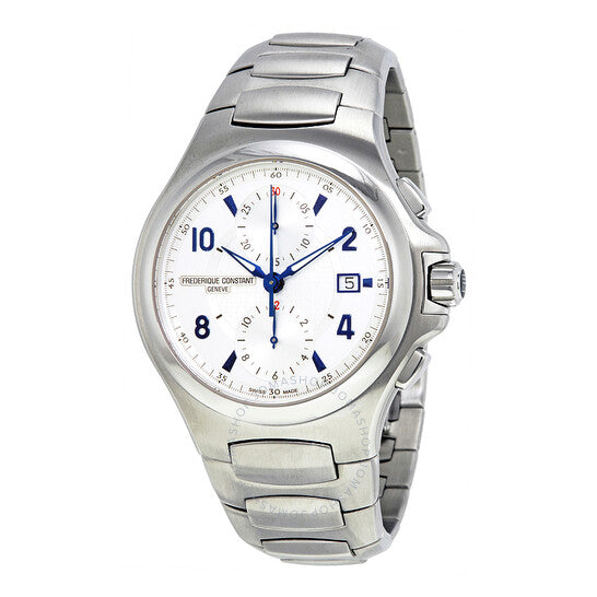 علبة فضية اللون من الفولاذ المقاوم للصدأ مع سوار فضي اللون. إطار ثابت من الفولاذ المقاوم للصدأ فضي اللون. ميناء فضي مع عقارب زرقاء مضيئة ومؤشر وعلامات ساعات رقمية عربية. علامات دقائق حول الحافة الخارجية. نوع الميناء: تناظري. عقارب مضيئة. عرض التاريخ عند موضع الساعة 3. كرونوغراف - ميناءان فرعيان يعرضان: 30 دقيقة و12 ساعة. حركة أوتوماتيكية من عيار فريدريك كونستانت FC-393، تحتوي على 25 جوهرة، تنبض بتردد 28800 ذبذبة في الساعة، ولديها احتياطي طاقة لمدة 46 ساعة تقريبًا. زجاج ياقوت مقاوم للخدش. غطاء خلفي شفاف. شكل العلبة دائري، مقاسها: 44.3 مم. مشبك قابل للطي. مقاومة للماء حتى عمق 100 متر / 330 قدمًا. الوظائف: كرونوغراف، تاريخ، ساعة، دقيقة، ثانية. طراز ساعة رسمية. ملصق الساعة: صناعة سويسرية. ساعة فريدريك كونستانت أوتوماتيكية للرجال بمينا فضي FC-393AS4NH6B.