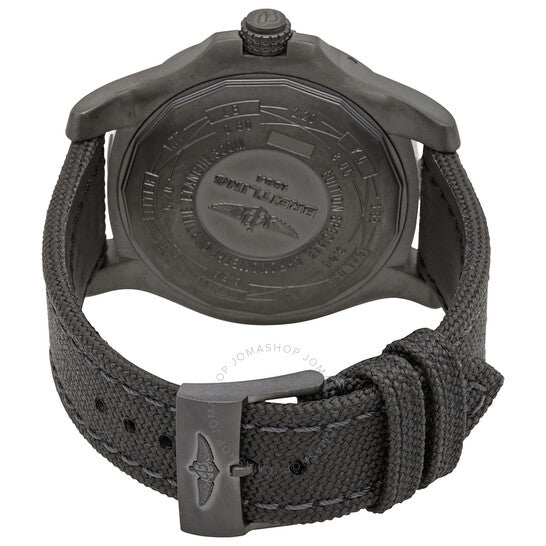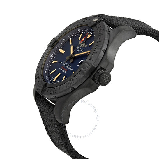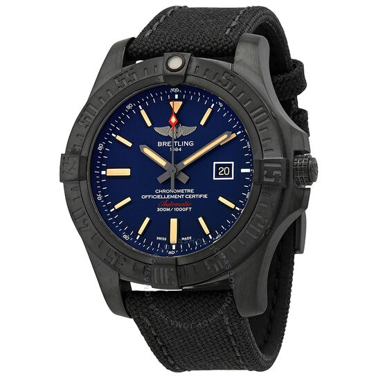 علبة من التيتانيوم الأسود مع حزام قماش أسود (أنثراسيت). إطار دوار أحادي الاتجاه من التيتانيوم الأسود. ميناء أزرق مع عقارب مضيئة من الأنثراسيت وعلامات ساعات مؤشرة. علامات الدقائق. علامات 1/100 من الثانية حول الحافة الخارجية. نوع الميناء: تناظري. عقارب وعلامات مضيئة. عرض التاريخ عند موضع الساعة 3. حركة بريتلينج أوتوماتيكية كاليبر 17، مبنية على ETA 2824-2، تحتوي على 25 جوهرة، تنبض بمعدل 28800 ذبذبة في الساعة، ولديها احتياطي طاقة لمدة 42 ساعة تقريبًا. كريستال ياقوت مقاوم للخدش. تاج مغلق ببرغي. ظهر علبة صلب. شكل دائري. حجم العلبة: 48 مم. سمك العلبة: 14.20 مم. عرض السوار: 24 مم. مشبك تانغ. مقاومة للماء حتى عمق 300 متر / 1000 قدم. الوظائف: التاريخ، الساعة، الدقيقة، الثانية. معلومات إضافية: إصدار محدود من 250 قطعة. طراز ساعة الغوص. علامة الساعة: صناعة سويسرية. ساعة بريتلينغ أفينجر بلاكبيرد أوتوماتيكية للرجال بمينا أزرق، طراز V173104A/CA23/100W.
