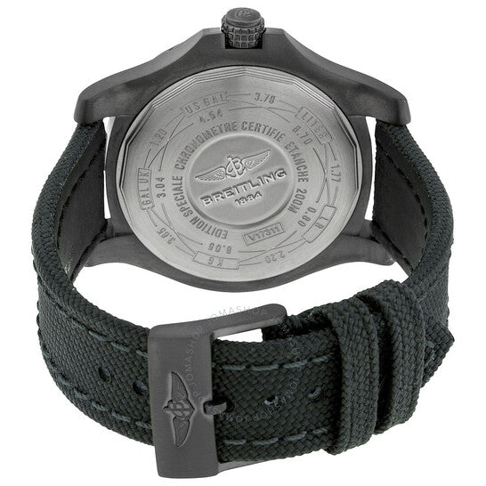 علبة من التيتانيوم الأسود مع سوار قماش عسكري أسود بركانيّ. إطار دوار أحادي الاتجاه من التيتانيوم الأسود. ميناء أسود بعقارب مضيئة وعلامات ساعات. علامات دقائق. علامات ثانية 1/100 حول الحافة الخارجية. نوع الميناء: تناظري. عقارب وعلامات مضيئة. عرض التاريخ عند موضع الساعة الثالثة. حركة بريتلينغ أوتوماتيكية كاليبر 17، مبنية على ETA 2824-2، تحتوي على 25 جوهرة، تنبض بمعدل 28800 ذبذبة في الساعة، ولديها احتياطي طاقة لمدة 42 ساعة تقريبًا. زجاج من الياقوت المقاوم للخدش. تاج مُغلق ببرغي. غطاء خلفي صلب. شكل دائري. حجم العلبة: 44 مم. سمك العلبة: 12.7 مم. عرض السوار: 22 مم. مشبك تانغ. مقاومة للماء حتى عمق 200 متر / 660 قدمًا. الوظائف: كرونومتر، تاريخ، ساعة، دقيقة، ثانية. سلسلة أفنجر بلاكبيرد. طراز ساعة عسكري. ملصق الساعة: صناعة سويسرية. ساعة بريتلينج افينجر بلاك بيرد الأوتوماتيكية للرجال V1731110-BD74GCVT.