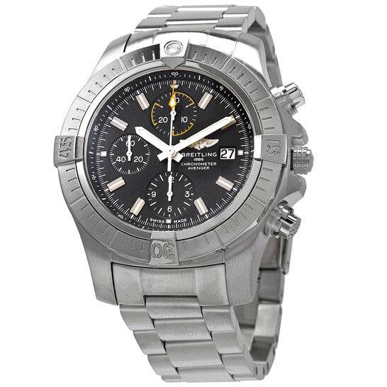 علبة وسوار من الفولاذ المقاوم للصدأ فضي اللون. إطار دوار أحادي الاتجاه من الفولاذ المقاوم للصدأ فضي اللون. ميناء أسود مع عقارب وعلامات ساعات فضية مضيئة. علامات دقائق. علامات 1/100 ثانية حول الحافة الخارجية. نوع الميناء: تناظري. عقارب وعلامات مضيئة. عرض التاريخ عند موضع الساعة 3. كرونوغراف - ثلاثة أقراص فرعية تعرض: 60 ثانية، 30 دقيقة، و12 ساعة. حركة بريتلينغ كاليبر 13 أوتوماتيكية، مبنية على ETA Valjoux 7750، تحتوي على 25 جوهرة، تنبض بمعدل 28800 ذبذبة في الساعة، ولديها احتياطي طاقة لمدة 42 ساعة تقريبًا. زجاج ياقوت مقاوم للخدش. تاج مُغلق ببرغي. غطاء خلفي صلب. شكل العلبة دائري، مقاس العلبة: 45 مم، سمكها: 16.46 مم. عرض السوار: 22 مم. مشبك قابل للطي مع مفتاح أمان. مقاومة للماء حتى عمق ٣٠٠ متر / ١٠٠٠ قدم. الوظائف: كرونوغراف، تاريخ، ساعات، دقائق، ثوانٍ، كرونومتر. سلسلة أفينجر كرونوغراف. طراز ساعة غوص. علامة الساعة: سويسرية الصنع. ساعة بريتلينغ أفينجر كرونوغراف أوتوماتيكية للرجال بمينا أسود، A13317101B1A1.