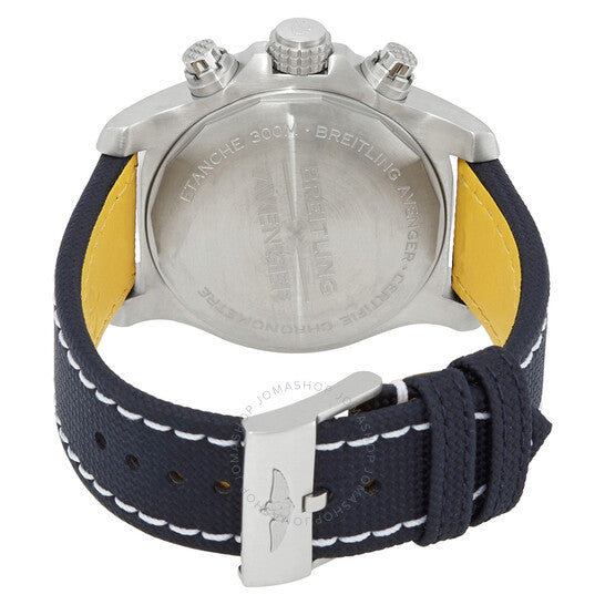 علبة من الفولاذ المقاوم للصدأ مع سوار جلدي أزرق (عسكري). إطار دوار أحادي الاتجاه من الفولاذ المقاوم للصدأ. ميناء أزرق مع عقارب وعلامات ساعات فضية مضيئة. علامات دقائق. علامات 1/100 ثانية حول الحافة الخارجية. نوع الميناء: تناظري. عقارب وعلامات مضيئة. عرض التاريخ عند موضع الساعة 3. كرونوغراف - ثلاثة أقراص فرعية تعرض: 60 ثانية، 30 دقيقة، و12 ساعة. حركة بريتلينغ أوتوماتيكية كاليبر 13، مبنية على ETA Valjoux 7750، تحتوي على 25 جوهرة، تنبض بمعدل 28800 ذبذبة في الساعة، ولديها احتياطي طاقة لمدة 42 ساعة تقريبًا. زجاج ياقوت مقاوم للخدش. تاج مُغلق ببرغي. غطاء خلفي صلب. شكل دائري. حجم العلبة: 43 مم. سمك العلبة: 16.43 مم. عرض السوار: 22 مم / 20 مم. مشبك تانغ. مقاومة للماء حتى عمق ٣٠٠ متر / ١٠٠٠ قدم. الوظائف: كرونوغراف، تاريخ، ساعات، دقائق، ثوانٍ، كرونومتر. طراز ساعة غوص. علامة الساعة: صناعة سويسرية. ساعة بريتلينغ أفينجر كرونوغراف أوتوماتيكية للرجال بمينا أزرق A13385101C1X1.