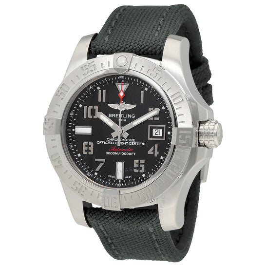 علبة من الفولاذ المقاوم للصدأ مع سوار قماش أخضر. إطار دوار أحادي الاتجاه من الفولاذ المقاوم للصدأ. ميناء أسود بعقارب فضية مضيئة وعلامات ساعات بأرقام عربية. علامات دقائق. علامات 1/100 حول الحافة الخارجية. نوع الميناء: تناظري. عقارب وعلامات مضيئة. عرض التاريخ عند موضع الساعة 3. حركة بريتلينغ أوتوماتيكية كاليبر 17 مع احتياطي طاقة لمدة 40 ساعة. زجاج من الياقوت المقاوم للخدش. تاج مقفل ببرغي. غطاء خلفي صلب. حجم العلبة: 45 مم. سمكها: 18 مم. شكلها دائري. عرض السوار: 22 مم / 20 مم. مشبك تانغ. مقاومة للماء حتى عمق 3000 متر / 10000 قدم. الوظائف: كرونومتر، تاريخ، ساعة، دقيقة، ثانية. تصميم ساعة فاخرة. علامة الساعة: صناعة سويسرية. ساعة بريتلينغ أفنجر II سي وولف أوتوماتيكية للرجال A1733110-BC31GCVT.