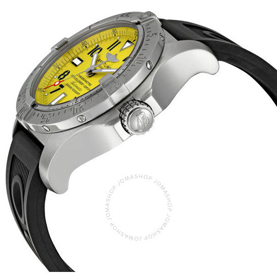 علبة من الفولاذ المقاوم للصدأ مع سوار مطاطي أسود من Ocean Racer. إطار أحادي الاتجاه من الفولاذ المقاوم للصدأ. ميناء أصفر بعقارب مضيئة وعلامات ساعات رقمية عربية. مؤشرات عند الساعة 6 و9 و12. علامات دقائق حول الحافة الخارجية. يظهر عرض التاريخ عند الساعة 3. حركة ميكانيكية ذاتية التعبئة. كريستال ياقوت مقاوم للخدش. تاج مُغلق ببرغي مع حشوتين. غطاء خلفي صلب. قطر العلبة: 45.40 مم. سُمكها: 18.50 مم. مشبك قابل للطي. مقاومة للماء حتى عمق 3000 متر/10000 قدم. الوظائف: الساعات، الدقائق، الثواني، التقويم. ساعة بريتلينغ أفنجر سي وولف للرجال بمينا أصفر، A1733010-I513BKRD.