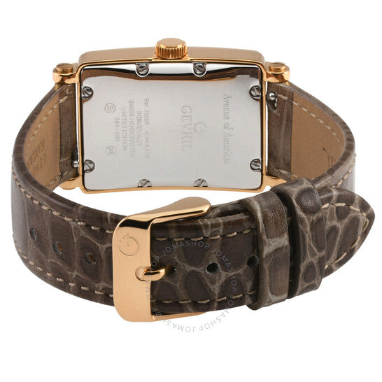 علبة من الفولاذ المقاوم للصدأ بلون الذهب الوردي مع حزام من الجلد الطبيعي بلون بني فاتح. إطار ثابت من الفولاذ المقاوم للصدأ بلون الذهب الوردي. ميناء من عرق اللؤلؤ مع عقارب بلون الذهب الوردي وعلامات ساعات بأرقام عربية. مقياس دقائق حول الحافة الداخلية. نوع الميناء: تناظري. عرض التاريخ عند موضع الساعة السادسة. حركة كوارتز. زجاج ياقوت مقاوم للخدش. تاج قابل للسحب/الدفع. غطاء خلفي صلب. شكل العلبة مستطيل، مقاس العلبة: 32 مم، سمكها: 9.5 مم. عرض السوار: 16 مم. مشبك بإبزيم. مقاومة للماء حتى عمق 50 مترًا / 165 قدمًا. الوظائف: التاريخ، الساعة، الدقائق، الثواني. سلسلة أفينيو أوف أمريكاز الصغيرة. تصميم ساعة فاخرة. علامة الساعة: صناعة سويسرية. ساعة جيفريل أفينيو أوف أمريكاز الصغيرة كوارتز نسائية 7345R-3.
