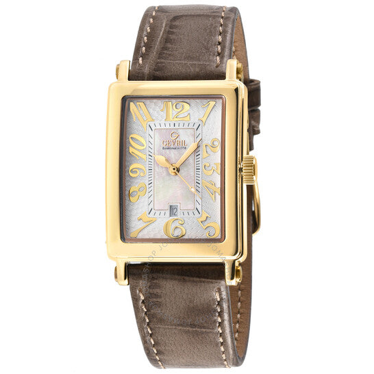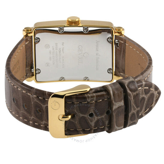 علبة من الفولاذ المقاوم للصدأ بلون الذهب الأصفر مع حزام من الجلد الأصلي بلون بني فاتح. إطار ثابت من الفولاذ المقاوم للصدأ بلون الذهب الأصفر. ميناء من عرق اللؤلؤ مع عقارب بلون الذهب الأصفر وعلامات ساعات بأرقام عربية. مقياس دقائق حول الحافة الداخلية. نوع الميناء: تناظري. عرض التاريخ عند موضع الساعة السادسة. حركة كوارتز. زجاج ياقوت مقاوم للخدش. تاج قابل للسحب/الدفع. غطاء خلفي صلب. شكل العلبة مستطيل، مقاس العلبة: 32 مم، سمكها: 9.5 مم. عرض السوار: 16 مم. مشبك بإبزيم. مقاومة للماء حتى عمق 50 مترًا / 165 قدمًا. الوظائف: التاريخ، الساعة، الدقائق، الثواني. سلسلة أفينيو أوف أمريكاز المصغرة. تصميم ساعة فاخرة. علامة الساعة: صناعة سويسرية. ساعة جيفريل أفينيو أوف أمريكاز المصغرة كوارتز نسائية 7444Y-3.
