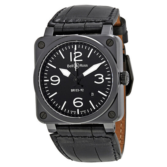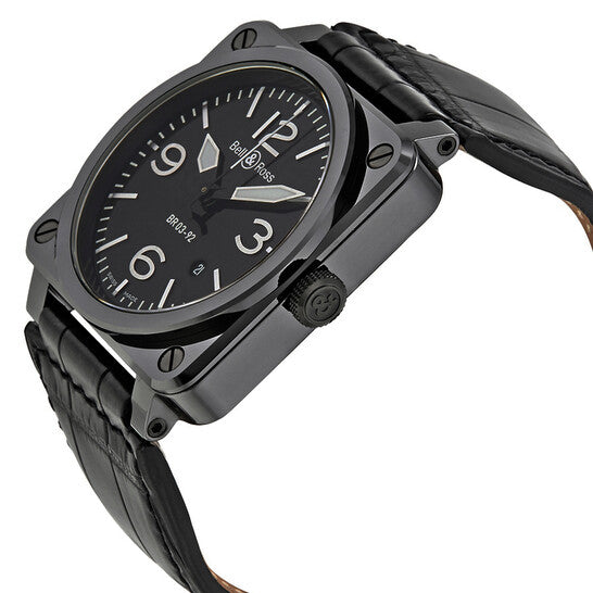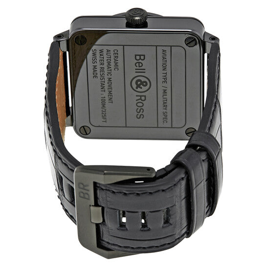 علبة من السيراميك الأسود مع حزام أسود من جلد التمساح. إطار ثابت. ميناء أسود بعقارب فضية مضيئة ومؤشرات ساعات. أرقام عربية تُشير إلى الساعات 3 و6 و9 و12. مؤشرات دقائق حول الحافة الخارجية. نوع الميناء: تناظري. عقارب ومؤشرات مضيئة. عرض التاريخ بين الساعة 4 و5. حركة أوتوماتيكية باحتياطي طاقة لمدة 42 ساعة. زجاج ياقوت مقاوم للخدش. تاج قابل للسحب/الدفع. غطاء خلفي صلب. حجم العلبة: 42 مم. سُمكها: 9.80 مم. شكلها دائري. مشبك تانغ. مقاومة للماء حتى عمق 100 متر / 330 قدمًا. الوظائف: التاريخ، الساعة، الدقيقة، الثانية. تصميم ساعة فاخرة. علامة الساعة: صناعة سويسرية. ساعة بيل آند روس أفييشن أوتوماتيكية للرجال بمينا أسود BR0392-CE-BLP-SCR.