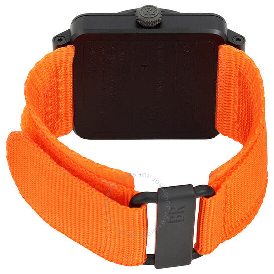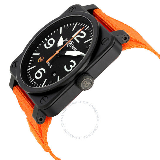 علبة فولاذية سوداء مطلية بتقنية PVD مع سوار من قماش برتقالي. إطار ثابت أسود مطلي بتقنية PVD. ميناء أسود مع عقارب ومؤشرات ساعات فضية اللون. أرقام عربية تُشير إلى الساعات 3 و6 و9 و12. علامات دقائق حول الحافة الخارجية. نوع الميناء: تناظري. عقارب ومؤشرات مضيئة. عرض التاريخ بين الساعة 4 و5. حركة أوتوماتيكية مع احتياطي طاقة لمدة 40 ساعة. زجاج من الياقوت المقاوم للخدش. تاج لولبي. غطاء خلفي صلب. حجم العلبة: 42 مم. شكل دائري. مشبك تانغ. مقاومة للماء حتى عمق 100 متر / 330 قدمًا. الوظائف: التاريخ، الساعة، الدقيقة، الثانية. معلومات إضافية: إصدار محدود من 500 قطعة. طراز ساعة فاخرة. علامة الساعة: صناعة سويسرية. إصدارات الساعة: BR0392 O CA، BR0392.O.CA، BR0392OCA. ساعة بيل آند روس للطيران أوتوماتيكية للرجال بمينا أسود BR0392-O-CA.