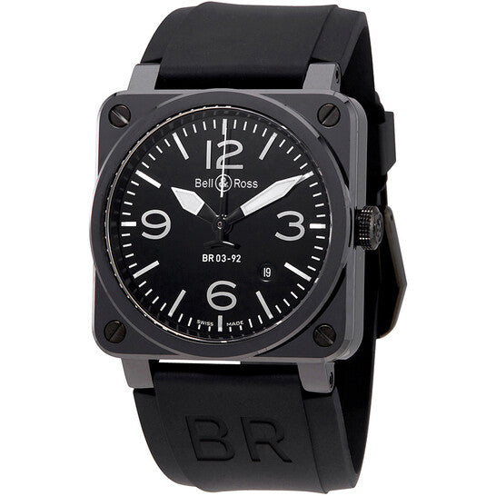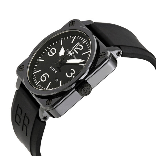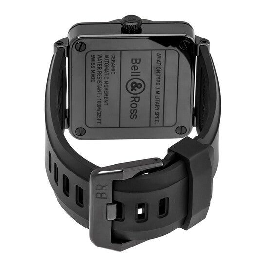 علبة من السيراميك الأسود مع سوار مطاطي أسود. إطار ثابت. ميناء أسود بعقارب فضية اللون وأرقام عربية للساعات. نوع الميناء: تناظري. عقارب مضيئة. عرض التاريخ بين الساعة الرابعة والخامسة. آلية حركة أوتوماتيكية. زجاج ياقوتي مقاوم للخدش. حجم العلبة: 42 مم. شكل العلبة مربع. مشبك تانغ. مقاومة للماء حتى عمق 100 متر / 330 قدمًا. الوظائف: التاريخ، الساعة، الدقائق، الثانية. تصميم ساعة فاخر. علامة الساعة: صناعة سويسرية. ساعة بيل آند روس أفييشن أوتوماتيكية للرجال بمينا أسود BR0392-CER-BLP/SRB.