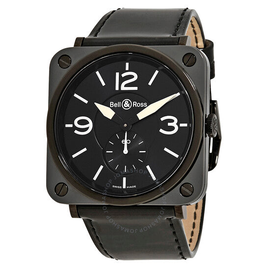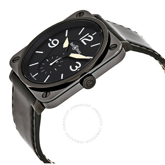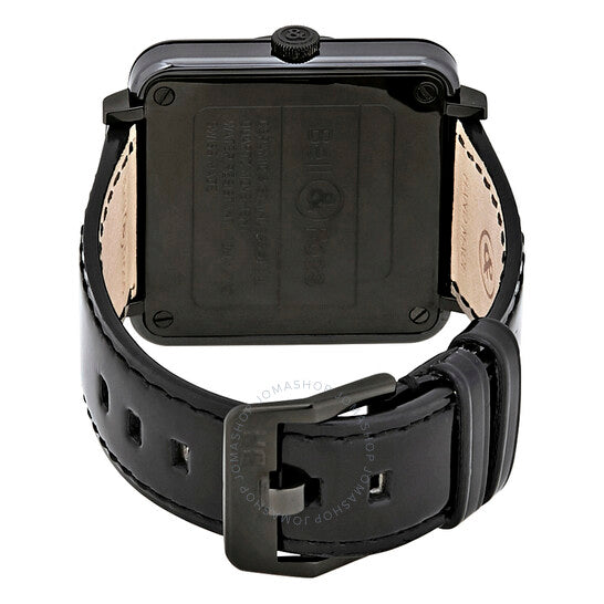 علبة من السيراميك والفولاذ الأسود مع سوار من الجلد الأسود اللامع. إطار ثابت من السيراميك الأسود. ميناء أسود بعقارب بيضاء وعلامات ساعات. أرقام عربية تُشير إلى الساعات 3 و9 و12. نوع الميناء: تناظري. ميناء فرعي للثواني فوق الميناءات الفرعية للساعة 6. آلية حركة كوارتز. زجاج من الياقوت المقاوم للخدش. تاج لولبي. غطاء خلفي صلب. حجم العلبة: 39 مم. شكل العلبة مربع. مشبك تانغ. مقاومة للماء حتى عمق 50 مترًا / 165 قدمًا. الوظائف: الساعات، الدقائق، الثواني. تصميم كاجوال. علامة الساعة: صناعة سويسرية. ساعة بيل آند روس للطيران للرجال من الجلد الأسود اللامع BRS-BL-CEM-BKPAT.
