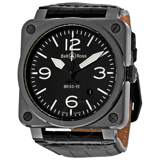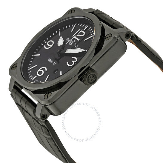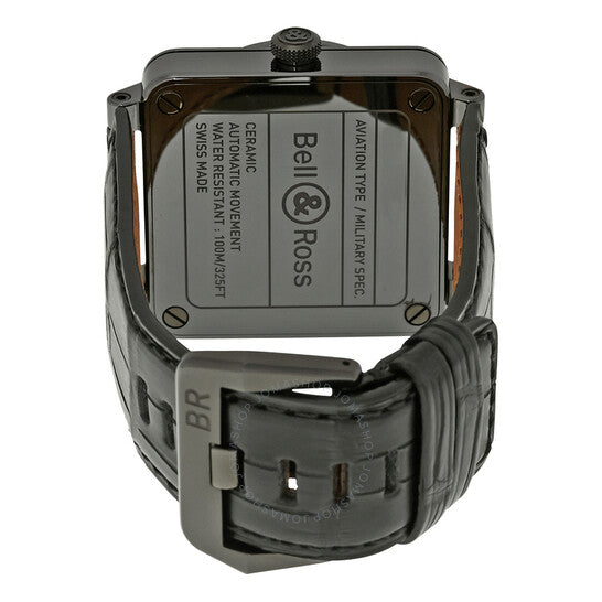 علبة من السيراميك الأسود مع حزام أسود من جلد التمساح. إطار ثابت من السيراميك الأسود. ميناء أسود بعقارب مضيئة وعلامات ساعات لاصقة. أرقام عربية تُشير إلى الساعات 3 و6 و9 و12. علامات دقائق حول الحافة الخارجية. نوع الميناء: تناظري. عقارب وعلامات مضيئة. عرض التاريخ بين الساعة 4 و5. حركة أوتوماتيكية باحتياطي طاقة يصل إلى 40 ساعة. زجاج ياقوت مقاوم للخدش. غطاء خلفي صلب. قطر العلبة: 42 مم. سُمكها: 11.5 مم. شكلها مربع. عرض السوار: 33 مم. مشبك تانغ. مقاومة للماء حتى عمق 100 متر / 330 قدمًا. الوظائف: التاريخ، الساعة، الدقائق، الثواني. تصميم ساعة فاخرة. علامة الساعة: صناعة سويسرية. ساعة بيل آند روس للطيران السوداء BR0392-CERAM-ALI.