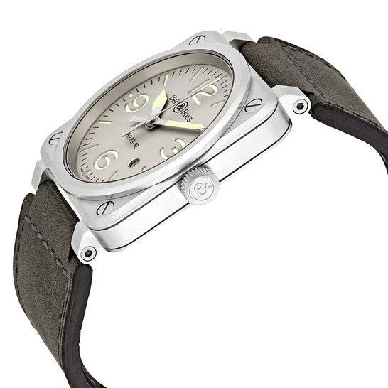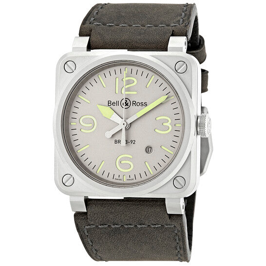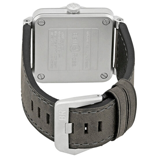 علبة من الفولاذ المقاوم للصدأ فضية اللون مع سوار جلدي رمادي. إطار ثابت فضي اللون. ميناء رمادي مع عقارب فضية اللون وأرقام عربية للساعات. نوع الميناء: تناظري. عقارب وعلامات مضيئة. عرض التاريخ بين موضعي الساعة 4 و5. حركة أوتوماتيكية من بيل آند روس، عيار BR-CAL.302، مع احتياطي طاقة لمدة 38 ساعة. زجاج ياقوتي مقاوم للخدش. حجم العلبة: 42 مم. شكل العلبة مربع. مقاومة للماء حتى عمق 100 متر / 330 قدمًا. الوظائف: التاريخ، الساعة، الدقيقة، الثانية. معلومات إضافية: إصدار محدود من 500 قطعة. طراز ساعة رسمية. علامة الساعة: صناعة سويسرية. ساعة بيل آند روس أوتوماتيكية للرجال، طراز BR0392-GR-ST/SCA، طراز الطيران، ميناء رمادي.