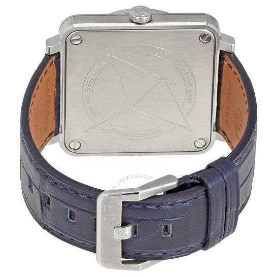 علبة من الفولاذ المقاوم للصدأ فضية اللون مع سوار من جلد التمساح الأزرق. إطار ثابت من الفولاذ المقاوم للصدأ مرصع بالألماس. ميناء أزرق داكن مع عقارب فضية اللون. نوع الميناء: تناظري. حركة كوارتز من بيل آند روس، عيار BR-CAL.102. زجاج ياقوتي مقاوم للخدش. غطاء خلفي صلب. حجم العلبة: 39 مم. شكلها مربع. مقاومة للماء حتى عمق 100 متر / 330 قدمًا. الوظائف: الساعات والدقائق. معلومات إضافية: إطار مرصع بـ (66 ماسة، وزنها الإجمالي 0.99 قيراط). تصميم ساعة فاخر. علامة الساعة: صناعة سويسرية. ساعة بيل آند روس للطيران النسائية بمينا أزرق داكن مرصعة بالألماس، BRS-DIAEAGLE-BZ.