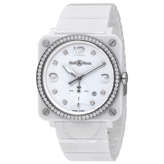 علبة من السيراميك الأبيض مع سوار من السيراميك الأبيض. إطار ثابت مرصع بالألماس. ميناء أبيض بعقارب فضية اللون وعلامات ساعات بأرقام عربية مرصعة بالألماس. نوع الميناء: تناظري. عرض التاريخ بين موضعي الساعة 4 و5. موانئ فرعية للثواني الصغيرة. حركة كوارتز من بيل آند روس، عيار BR-CAL.102. زجاج ياقوت مقاوم للخدش. غطاء خلفي صلب. حجم العلبة: 39 مم. شكل العلبة مربع. مقاومة للماء حتى عمق 100 متر / 330 قدمًا. الوظائف: التاريخ، الساعة، الدقائق، الثانية. معلومات إضافية: إطار مرصع بـ 66 ماسة (0.12 قيراط). طراز ساعة فاخرة. علامة الساعة: صناعة سويسرية. ساعة بيل آند روس أفييشن نسائية من السيراميك، ميناء أبيض مرصع بالألماس، BRS-WHITE-DIA-C.
