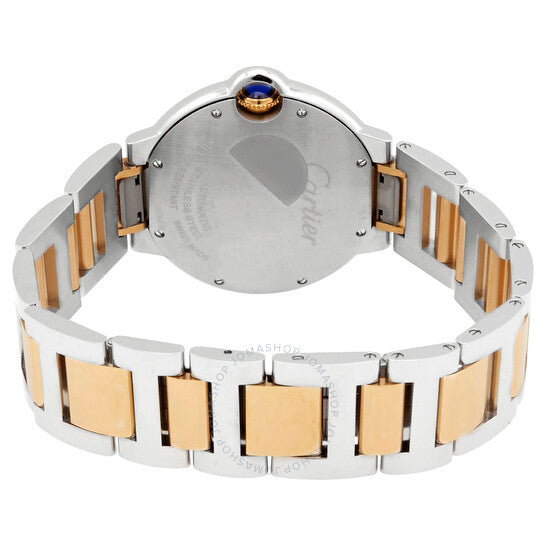 علبة من الفولاذ المقاوم للصدأ مع سوار من الفولاذ المقاوم للصدأ بوصلات من الذهب الأصفر عيار 18 قيراطًا. إطار ثابت من الفولاذ المقاوم للصدأ. ميناء فضي بعقارب زرقاء على شكل سيف وعلامات ساعات بأرقام رومانية. علامات دقائق حول حلقة داخلية. نوع الميناء: تناظري. حركة كارتييه أوتوماتيكية عيار 076، مبنية على ETA 2670، تحتوي على 25 جوهرة، تنبض بمعدل 28800 ذبذبة في الساعة، ولديها احتياطي طاقة لمدة 38 ساعة تقريبًا. زجاج من الياقوت المقاوم للخدش. تاج قابل للسحب/الدفع. غطاء خلفي صلب. شكل دائري. حجم العلبة: 36 مم. سمكها: 12 مم. مشبك مخفي قابل للطي. مقاومة للماء حتى عمق 30 مترًا / 100 قدم. الوظائف: الساعات، الدقائق، الثواني. سلسلة بالون بلو. تصميم ساعة فاخرة. علامة الساعة: صناعة سويسرية. ساعة كارتييه بالون بلو أوتوماتيكية نسائية بمينا فضي w2bb0030.