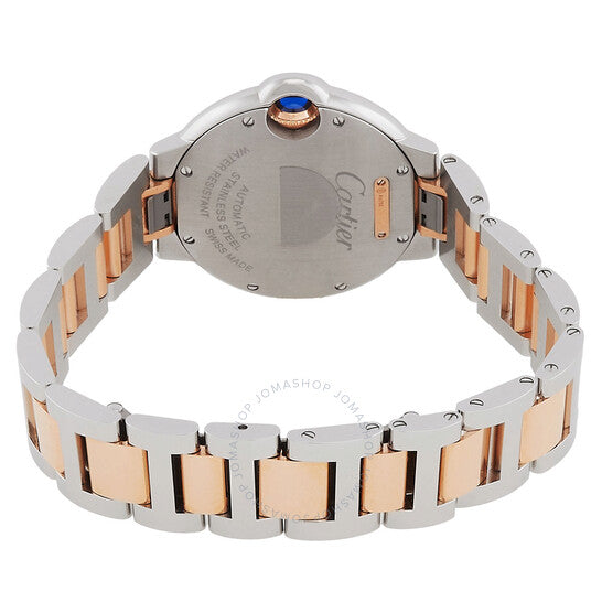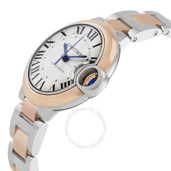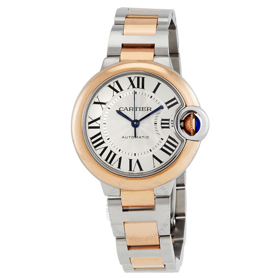 علبة من الفولاذ المقاوم للصدأ والذهب الوردي عيار 18 قيراطًا، مع سوار مصقول من الفولاذ المقاوم للصدأ والذهب الوردي عيار 18 قيراطًا. إطار ثابت من الذهب الوردي عيار 18 قيراطًا. ميناء فضي بعقارب على شكل سيف من الفولاذ المزرق، وعلامات ساعات بأرقام رومانية. مقياس دقائق حول الحافة الداخلية. نوع الميناء: تناظري. حركة كارتييه كاليبر 076 أوتوماتيكية، مبنية على ETA 2670، تحتوي على 25 جوهرة، تنبض بمعدل 28800 ذبذبة في الساعة، ولديها احتياطي طاقة لمدة 38 ساعة تقريبًا. زجاج من الياقوت المقاوم للخدش. تاج قابل للسحب/الدفع. غطاء خلفي صلب. شكل دائري، حجم العلبة: 33 مم، سمكها: 10 مم. مشبك قابل للطي مخفي. مقاومة للماء حتى عمق 30 مترًا / 100 قدم. الوظائف: الساعة، الدقيقة، الثانية. سلسلة بالون بلو. تصميم ساعة فاخرة. علامة الساعة: صناعة سويسرية. ساعة كارتييه بالون بلو أوتوماتيكية نسائية بمينا فضية w2bb0032.