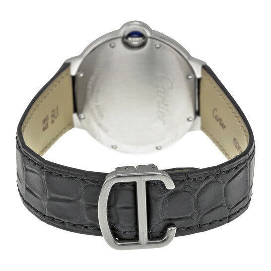 علبة من الفولاذ المقاوم للصدأ مع سوار أسود من جلد التمساح. إطار ثابت من الفولاذ المقاوم للصدأ. ميناء فضي لامع بعقارب على شكل سيف من الفولاذ المزرق، وعلامات ساعات بأرقام رومانية. علامات دقائق حول حلقة داخلية. نوع الميناء: تناظري. حركة كارتييه أوتوماتيكية عيار 076، مبنية على ETA 2670، تحتوي على 25 جوهرة، تنبض بمعدل 28800 ذبذبة في الساعة، ولديها احتياطي طاقة يدوم حوالي 38 ساعة. زجاج من الياقوت المقاوم للخدش. تاج مُخدد للدفع والسحب مرصع بحجر سبينيل كابوشون. غطاء خلفي صلب. شكل دائري. حجم العلبة: 36.6 مم. سمكها: 12.05 مم. عرض السوار: 20 مم. مشبك قابل للطي. مقاومة للماء حتى عمق 30 مترًا / 100 قدم. الوظائف: الساعات، الدقائق، الثواني. سلسلة بالون بلو دو كارتييه. تصميم ساعة فاخرة. علامة الساعة: صناعة سويسرية. ساعة كارتييه بالون بلو أوتوماتيكية للسيدات بمينا فضي W69017Z4.