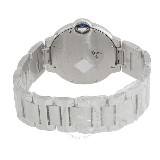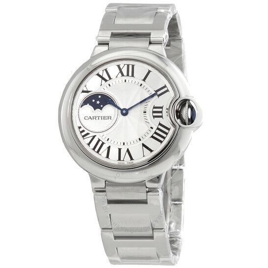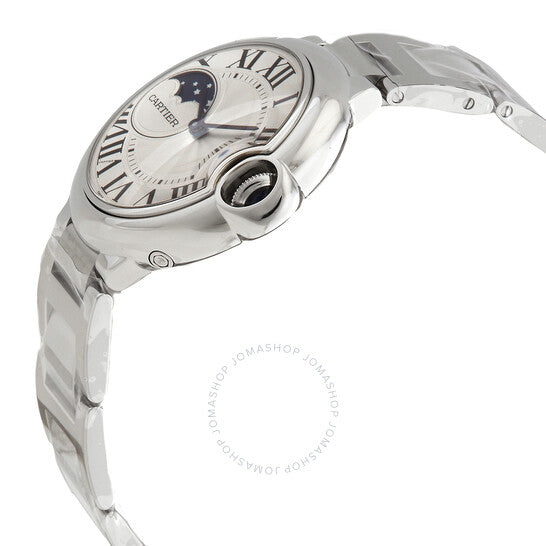 علبة وسوار من الفولاذ المقاوم للصدأ فضي اللون. إطار ثابت من الفولاذ المقاوم للصدأ فضي اللون. ميناء فضي (مُزخرف بنقشة غيوشيه) مع عقارب على شكل سيف من الفولاذ الأزرق وعلامات ساعات بأرقام رومانية. مقياس دقائق حول الحافة الداخلية. نوع الميناء: تناظري. ميناء فرعي واحد يعرض طور القمر. حركة أوتوماتيكية. كريستال ياقوت مقاوم للخدش. تاج مُخدّد، مُرصّع بحجر سبينل صناعي كابوشون. غطاء خلفي صلب. شكل دائري، مقاس العلبة: 37 مم، سُمكها: 13 مم. مشبك قابل للطي. مقاومة للماء حتى عمق 30 مترًا / 100 قدم. الوظائف: طور القمر، الساعة، الدقائق. سلسلة بالون بلو. طراز ساعة فاخرة. علامة الساعة: صناعة سويسرية. ساعة كارتييه بالون بلو أوتوماتيكية نسائية بمينا فضي WSBB0050.